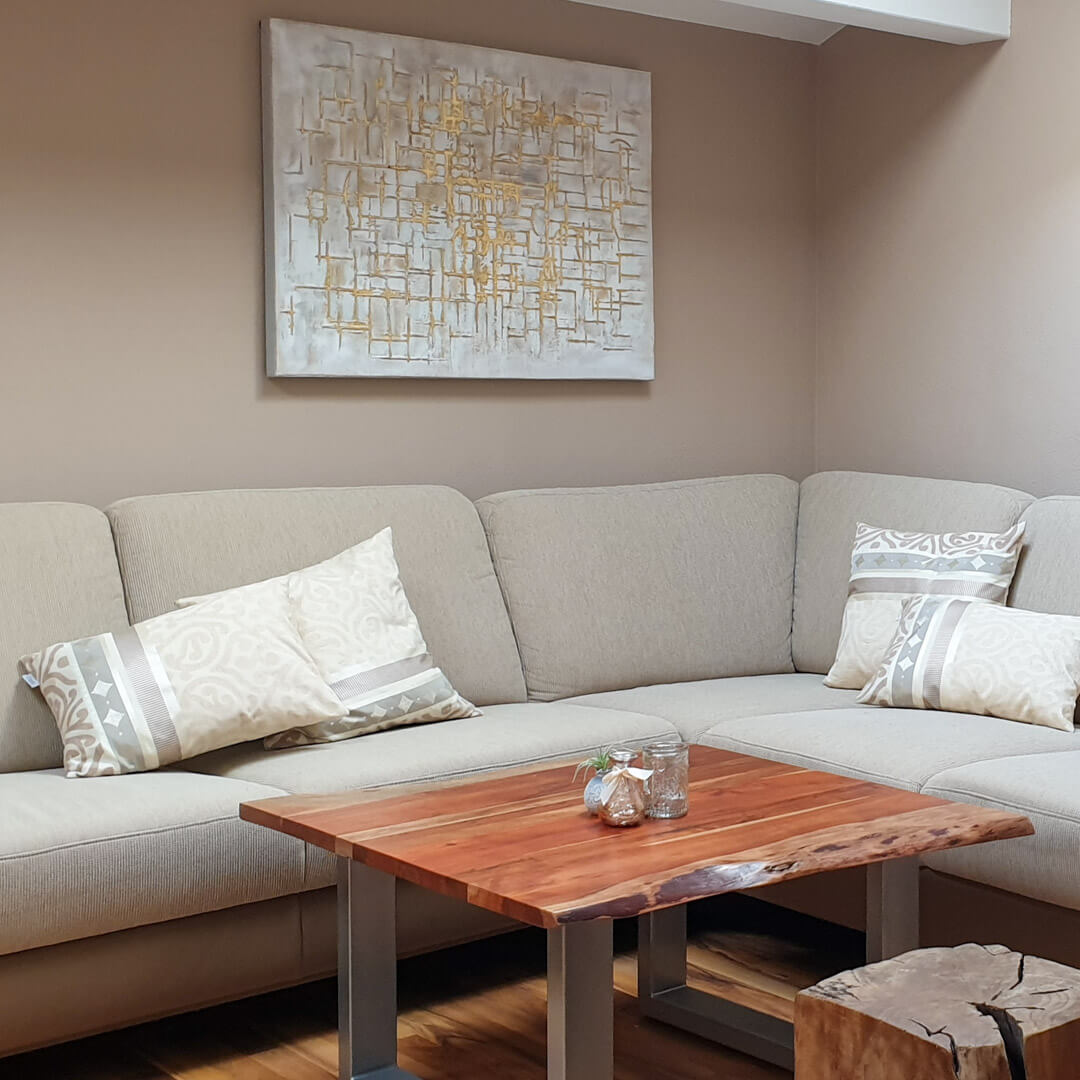 Das Labyrinth auf dem handgemalten Acrylbild ‘Glossy Maze‘ hebt sich durch sein schimmerndes Gold deutlich vom beigen Untergrund ab. Die Besucher Ihrer Kanzlei werden den Blick nicht mehr von diesem Gemälde abwenden können und sich in der Anmut des Irrgartens verlieren. In Ihrer Küche besticht das Kunstwerk durch seinen schlichten Look und sorgt für eine harmonische Atmosphäre. Ihr handgemaltes Gemälde erhalten Sie in der Größe 100x75cm. Anders als bei minderwertigen Drucken auf Leinwand können Sie auf unseren Unikaten jeden Pinselstrich fühlen. 0 Canvas pictures 1 Acrylgemälde Handmade Quality 2 2 0