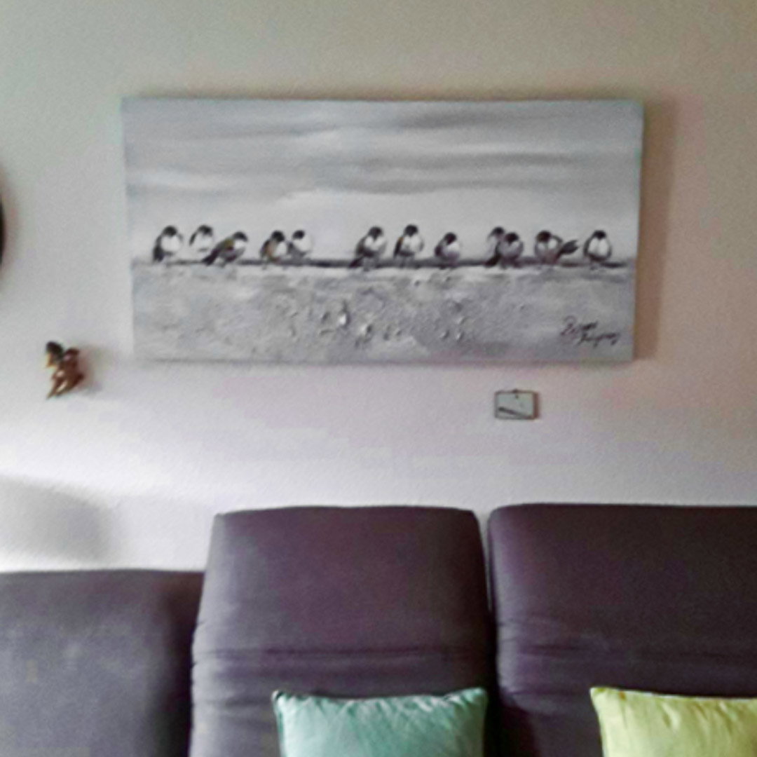 Mit 'Teamwork' ist nichts unmöglich – das ist das Motto dieses Schwarms von Vögeln. Das mit Glitter verzierte Bild mit den niedlichen Tieren verschönert jede kahle Wand, egal, ob in Ihrem Büro oder Zuhause im Wohnzimmer. Das in sanften Beigetönen gestaltete Gemälde sorgt garantiert für zahlreiche Komplimente für Ihren hervorragenden Geschmack. Ihr handgemaltes Gemälde erhalten Sie in der Größe 120x60cm. Anders als bei minderwertigen Drucken auf Leinwand können Sie auf unseren Unikaten jeden Pinselstrich fühlen. 0 Canvas pictures 1 Acrylgemälde Handmade Quality 2 2 0