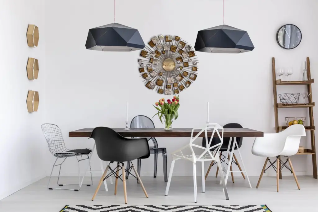 Klare Linien, scharfe Winkel und Metalloberflächen wirken Wunder in minimalistischen oder modernen Räumen. Denken Sie an Sechsecke, Würfel und asymmetrische Designs.